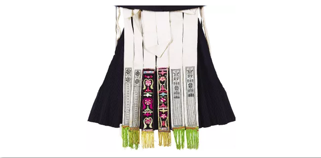 與北方少數(shù)民族圍腰的簡練大氣相比,南方少數(shù)民族的圍腰則更顯秀美精細(xì),且常常佩戴前后兩塊圍腰。貴州開陽地區(qū)苗族女子的盛裝造型,就包含了層疊式前圍腰和飄帶式后圍腰:前圍腰分為5層,每層皆以數(shù)紗繡為主要裝飾工藝,結(jié)合絳子邊與金屬裝飾線,并用棉布進(jìn)行包邊處理,圍腰面積較大且重量較沉,穿著時系在上衣與坎肩之外,上端兩角自然下翻。后圍腰以本白色棉布為料,分為6條飄帶,裝飾部位集中于飄帶下方,其中左右兩對飾有數(shù)紗繡,中間一對則為黑地彩色平繡,飄帶底部還縫綴彩色流蘇,頗具動感。細(xì)致的手工裝點(diǎn)出苗家女子之貌美,也彰顯著苗家女子之手巧。