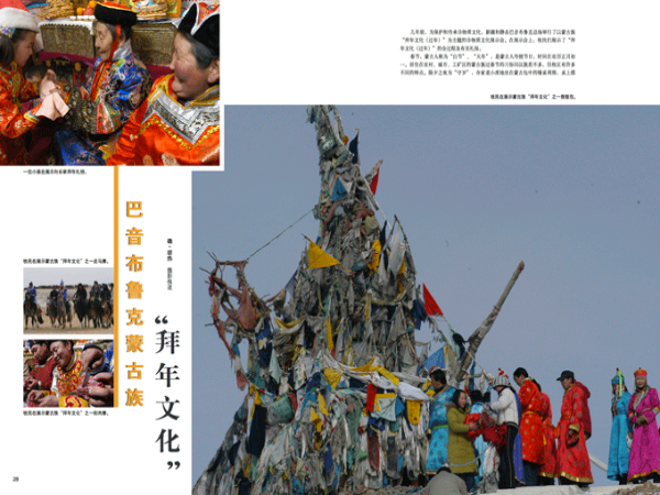幾年前,為保護和傳承非物質(zhì)文化,新疆和靜縣巴音布魯克總場舉行了以蒙古族“拜年文化(過年)”為主題的非物質(zhì)文化展示會。在展示會上,牧民們展示了“拜年文化(過年)”的全過程及有關(guān)禮俗。