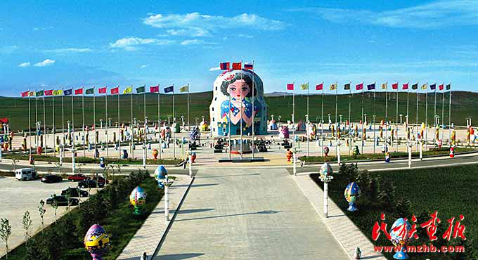 中國最大的陸運(yùn)口岸城市滿洲里的套娃廣場彩旗飄揚(yáng)(呼倫貝爾市委宣傳部供圖)