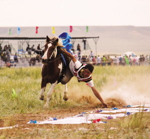 9日,在錫林郭勒盟阿巴嘎旗草原上,蒙古族選手們表演的騎馬射擊、騎馬射箭和騎馬拾哈達(dá)(即“馬上三藝”),讓來(lái)自俄羅斯、蒙古國(guó)、德國(guó)、臺(tái)灣等地的游客大開眼界。