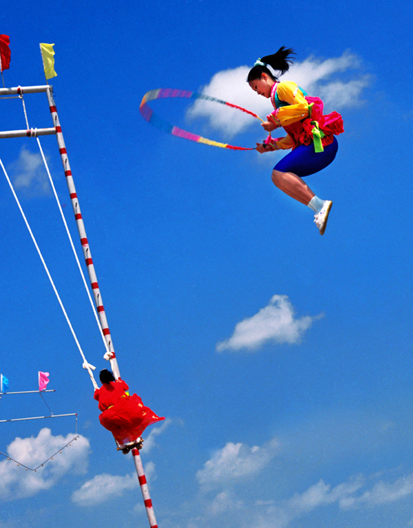 民間跳板長5.5米、寬4.0厘米左右,厚5.0至6.0厘米。跳板中間的下面立板墊,高3.0厘米。比賽時有專人守護板墊,防止跳板掉下。站在跳板兩端的姑娘輪番連續(xù)起跳,逐漸將對方彈送得更高。在身體騰空時能表演出驚險動作者最受歡迎,如剪式跳、旋轉跳、空翻跳,甚至跳藤圈、做造型、舞花環(huán)、揮彩帶等。靈巧優(yōu)美、五彩紛呈,令人眼花繚亂,驚嘆贊賞。