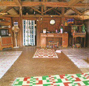 云南瑞麗的傣族民居。瑞麗的傣族民居是二層的竹樓,竹編外墻是利用竹皮正反面的紋理和光滑粗糙面編織的,從檐下垂直到底,均勻的縫隙透光通風(fēng),在強(qiáng)光照射下,其多變的幾何圖案更突出了工藝技巧和干欄式建筑的整體美感。屋面脊長,出檐短,大都用鍍鋅瓦楞鐵板替代草頂。樓層四壁以竹篾板封閉,開尺許小窗。外附短柱作下層重檐的斜撐,四周再加一圈矮柱,與墻面斜撐配。