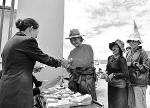 圖為壤塘縣瑟谷村農(nóng)牧民們?cè)谑卟朔N植基地領(lǐng)取務(wù)工收入。