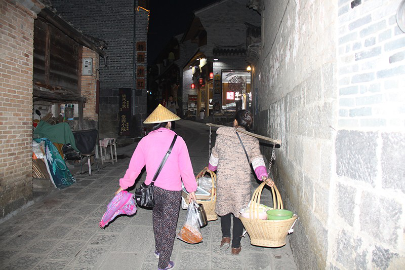 晚上7點(diǎn)多鐘,一群在小河里撲騰了一天的鴨子排著隊(duì)憨態(tài)可掬地回到寸家灣巷口,忙碌一天的人們也開(kāi)始回家。我正擔(dān)心晚上約定的采訪找不到地方,卻在圖書(shū)館旁邊的小巷里碰到了收工回家的姜聰留。她今天的松花糕賣了一板半,收入100多元。同行的一個(gè)姐妹幫她挑著擔(dān)子,姜聰留自己提著袋子和板凳,一路無(wú)語(yǔ)。臨近家門(mén)的路口,姜聰留從姐妹肩上接過(guò)擔(dān)子,眼神默契相視后,各自回家——這就是她們的生活。晚飯姜聰留到丈夫的大哥家吃土鍋?zhàn)?,兩家的院子只隔一墻,我也跟著進(jìn)了大哥江宗良的家門(mén)。