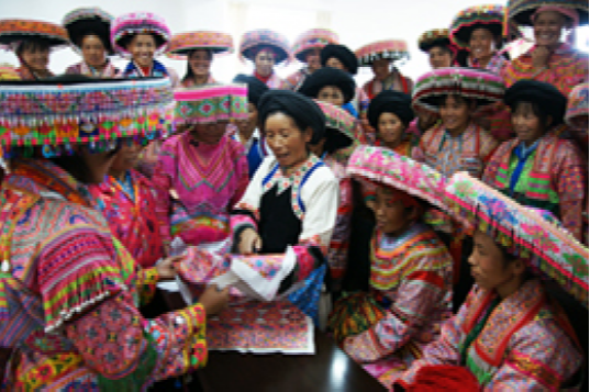 云南省南澗傳統(tǒng)的苗族服飾,均用多色麻線制作而成。在苗族服飾中,最讓人新奇的是女人的頭飾。苗族姑娘,習(xí)挽犄角形單發(fā)髻于頭頂,并將髻編于左或右。束發(fā)常用紗、綢帶,不同的苗族支系,采用的紗、綢顏色和花紋也有所不同,有的還佩戴系有“百家鎖”的銀項(xiàng)圈等。已婚婦女,一般都行編發(fā),并將發(fā)辮沿頭頂邊緣繞起來(lái),而且多以彎月形的梳子卡插于發(fā)盤頂心。在苗家人中,婦女的頭飾尤其特別,每逢喜事,他們都挽發(fā)髻如螺形,用較長(zhǎng)的青布或黑布,按縱向折疊為長(zhǎng)條,由一端起緊緊地盤繞于適合自己頭型的頂制帽基上。在疊繞成的大包頭之最外層表面上,配縫以彩帶垛疊的橫條,釘以32-48個(gè)貝雕,環(huán)圈密綴十字形亮子線,懸垂約5厘米的小銀鏈數(shù)10條,以及小銀鈴若干串。除精制的頭飾外,苗族女人的上衣下著都頗具特色。上衣有平裝和禮裝,下著有各式褶裙,腰上系的有桃花圍腰或有須腰帶。有的還有精美別致的短衣,也有特顯精巧的無(wú)袖布褂,以及彩繡鑲邊的布涼鞋等。在繁多的苗族服飾中,最顯著的特色是,不論衣裝大小,也不論上衣下著,在衣領(lǐng)、袖口、裙邊、裙底上,都鑲有臘染圖案和“米”字形花紋的條幅。苗家人穿上自己繡制的服飾,情趣非同一般,尤其是那些將要出嫁的大姑娘或已經(jīng)過(guò)門的新娘子,更會(huì)把自己打扮得花枝招展,漂亮迷人,對(duì)自己美如畫卷的服飾她們也是珍愛如寶。苗族男人的服飾,比女人簡(jiǎn)單,上衣為對(duì)襟短衣,下著褲子,一般也以短褲較多,頭飾多為半球形布帽或頂發(fā)外露的青色小包頭,但都有精制彩繡垛邊。大量使用飾物和刺繡,是苗族服飾的最大特色。