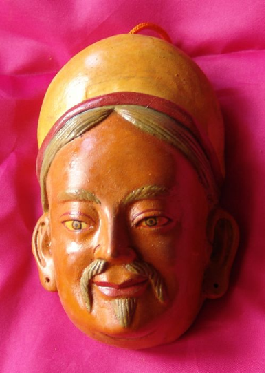 泥塑面具的制作也很有講究:“首先要將面具模型徹底風(fēng)干,然后在表面敷上摻有液體樹膠和面粉熬制而成的糨糊,再用一小塊布將風(fēng)干好的模子包好裹嚴,接著要敷一層柴薪混合物,同樣用另一塊布把泥模包實,反復(fù)四五次后,將模子放好讓它自然干透。這些步驟做完后,要用一根棍子敲打出包在里面的泥模,這樣就形成了布、樹、膠和面粉做成的一種面具。當(dāng)然,做好后還要進行彩繪、涂清漆,這樣才能讓一個面具光彩奪目?!边叞驼f道。